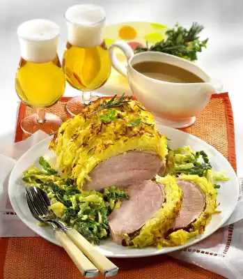 Mix the grated potatoes with egg yolk, season with salt and pepper. Remove meat from the oven after 15 minutes. Turn down the oven (electric cooker: 200 °C/ circulating air: 175 °C/ gas: level 3). Press the grated potatoes onto the surface and edge of the meat. Bake in the oven for another 55 minutes. After about 20 minutes, gradually add 600 ml stock. Meanwhile peel 1 onion and chop finely. Clean, wash and quarter the cabbage, cut out the stalk. Cut the savoy cabbage into fine strips. Heat the oil in a large pan. Sauté onion in it until translucent, add cabbage and fry while turning. Dust with flour, sweat on, deglaze with 500 ml vegetable stock and cream, bring to the boil and simmer covered for about 15 minutes.