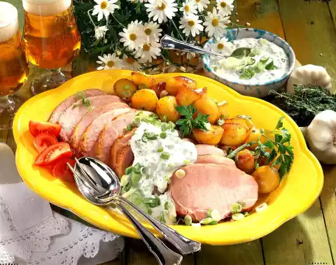 Take the meat out of the stock, let it rest for about 5 minutes and cut it into slices. Arrange meat and potatoes on a preheated plate. Add some dip. Garnish with tomato and parsley as desired. Sprinkle the dip with the remaining spring onions and add extra