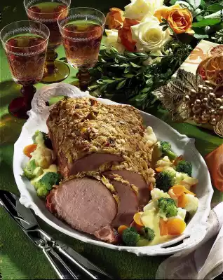 Cook the cauliflower and broccoli in salted water for about 12 minutes. After about 4 minutes add carrots and cook. Drain. Remove the roast and place it on the fat pan of the oven. For the crust, finely chop the toast in the universal chopper and mix with hazelnut leaves and the egg.