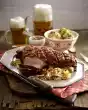 Wash the meat, dab dry and cut a pocket in the side. Wash and chop the herbs. Stir cream cheese and egg smooth and fold in the chopped herbs, except for some rosemary for garnishing. Fill herb cheese into the meat pocket, close tightly with wooden skewers and kitchen string. Place the meat on a fat pan and bake in a preheated oven (electric cooker: 200 °C/ gas: level 3) for approx. 1 1/4 hours. Sprinkle the rest of the rosemary on the roast about 15 minutes before the end of the cooking time.