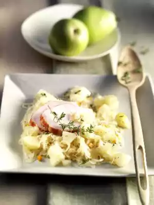 Pour on white wine. Cover and stew for about 30 minutes. Quarter the pears, remove the core and peel the pears. Dice pears. 10 minutes before the end of the cooking time mix pears and fig jam into the sauerkraut.