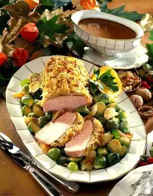 Season to taste with salt and pepper. Spread the potato mixture over the roast 20 minutes before the end of the frying time. Clean and wash the Brussels sprouts and cook in boiling salted water for about 15 minutes. Peel onions and cut into slices.