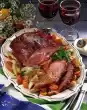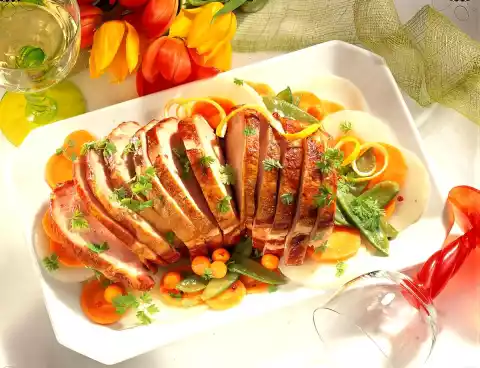Wash the cured pork loin and pat dry. Season with pepper. Put them on the fat pan and pour hot clarified butter over them. Bake in the preheated oven (electric: 200 °C/ gas: level 3) for 1 1/2 hours. In the meantime, peel and wash the carrots and kohlrabi for the vegetables. Cook in boiling salted water for 20 minutes.