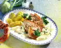 Add chervil leaves and red berries. For the sauce melt the remaining fat. Dust with flour. Add cream and stock while stirring constantly, bring to the boil. Season to taste with salt, pepper and lemon juice. Cut the roast open and arrange on a plate with the vegetables. Garnish with lemon spiral. Pass sauce extra