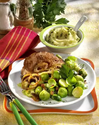 Sprinkle the Brussels sprouts with bacon and arrange on plates with parsley, some frying fat, meat and onion rings as desired. Add puree to taste, sprinkled with parsley in a small bowl.