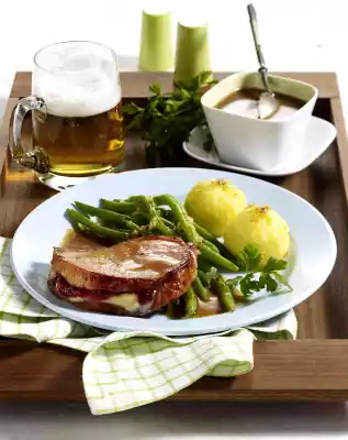 Clean and wash the beans. Form 8 dumplings from the dumpling dough. Let them stand in boiling salted water for 20-25 minutes. Cook the beans in boiling salted water for about 15 minutes. Wash the smoked pork chops, dab dry and cut 1 pocket in each.