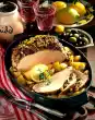 Add the beans and toss in. Lift the dumplings out of the water and let them drip off. Arrange chops with beans, dumplings and some sauce on plates. Garnish with parsley. Add the rest of the sauce.
