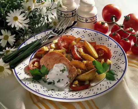 Wash potatoes thoroughly and cook in boiling salted water for about 18 minutes. Clean, wash and slice the tomatoes. Peel and roughly dice the onion. Wash chives, dab dry and cut into small rolls. Wash parsley, dab dry and chop, except for a few leaves for garnishing. Mix yoghurt, salt and pepper and season to taste. Stir 3/4 of the chives and parsley into the yoghurt. Drain the potatoes, rinse and peel. Cut the potatoes into slices. Heat 2 tablespoons of oil in a frying pan and fry the potato wedges for about 8 minutes, turning them over. Add the diced onion after 4 minutes and season with salt and pepper. Heat the remaining oil in a second pan and fry the chops on each side for about 2 minutes. Arrange potatoes, tomatoes and meat on plates, put 2 tablespoons of yoghurt on each meat, sprinkle with remaining chives and garnish with parsley leaves. Sprinkle with coloured pepper as desired