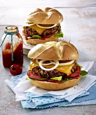 Cut the Kaiser roll in half horizontally. Spread the lower halves of the roll with ketchup, place lettuce and tomatoes on top. Put the meatballs on the tomatoes, cover each with a slice of cheddar. Put onion rings on top, place the top halves of the rolls on top.