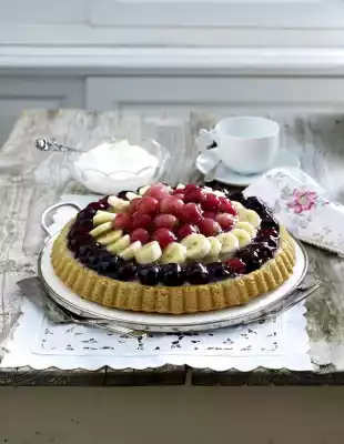 Bring 440 ml milk to the boil. Stir pudding powder, 3 tbsp sugar and 6 tbsp milk until smooth. Stir into the boiling milk, bring to the boil and simmer for 1 minute. Remove from the stove. Remove the cake from the oven, let it rest in the mould for a short time and turn it over on a cake rack. Spread the pudding on the base. Peel and slice the bananas. Spread the prepared fruit on the pudding. Mix the cake glaze powder and 2 tbsp. sugar. Mix 250 ml water and icing powder and bring to the boil while stirring with a wooden spoon. Spread the icing immediately over the fruits from the inside out while still hot.