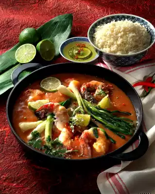 Season with salt, lime juice and soy sauce. Stir 3 tablespoons of fish stock and rice starch until smooth. Add the rest of the stock and soy sauce to the prawns and bring to the boil. Thicken with rice starch.