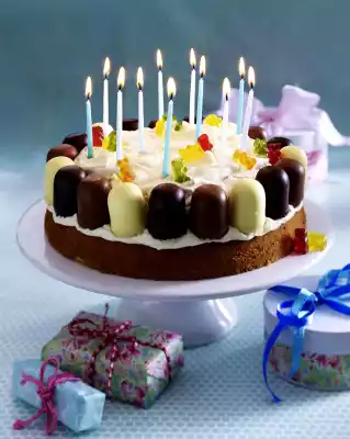 Smooth the apricot quark in the middle and spread with the rest of the pure quark cream. Chill the cake for at least 4 hours. Decorate with gummy bears and candles just before serving.