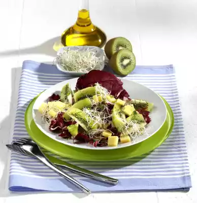 Wash and drain lettuce and sprouts. Leave 1 lettuce leaf whole, cut remaining leaves into strips. Cut kiwis into slices. Dice cheese. Mix vinegar with sweetener, salt and some pepper, then beat the oil into it. Mix all salad ingredients with the vinaigrette. Arrange the salad with the lettuce leaf on a plate