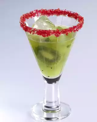 Put 50 ml lime juice and the sugar in a deep plate. Carefully dip the upper rim of the glasses into the lime juice first, let it drip off a little, then dip it into the sugar. Leave to dry. Peel the kiwis. Cut 4 nice slices from one kiwi. Roughly dice the rest of the kiwis.