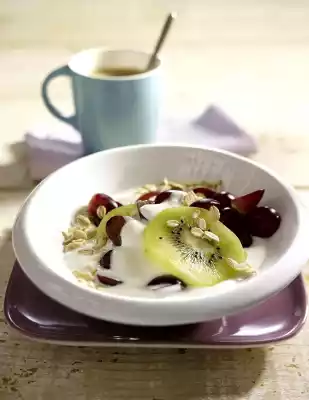Peel and slice the kiwi. Wash the grapes, pluck them from the stalks and cut in half. Arrange yoghurt with oatmeal and fruit in a bowl and serve immediately.