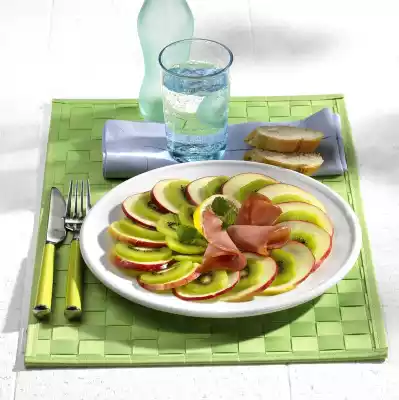 Peel the kiwis and cut into thin slices. Wash the apple and remove the core with an apple corer. Cut the apple into thin slices as well and sprinkle with lemon juice. Roll up the salmon ham. Put kiwis and apple in flakes on a plate and season with pepper. Place the salmon ham in the middle and garnish with lemon and mint. Serve with baguette
