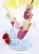 Line ice moulds with kiwi slices. Pour in fruit puree and place in the freezer for 30-40 minutes. Press the ice cream sticks into the centre of the ice cream. Let the ice cream freeze for at least 3 hours.