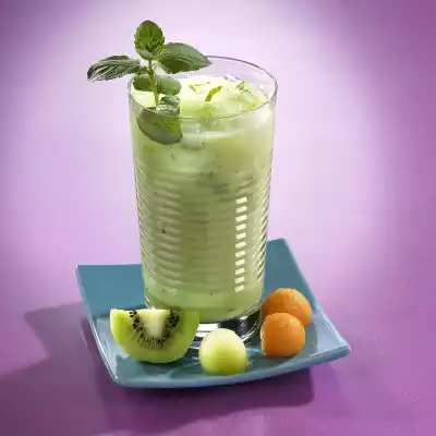 Finely puree melon, kiwi and buttermilk with sugar. Stir in mint. Pour the drink immediately into 4 glasses (250 ml each), fill up with crushed ice and decorate with set aside mint sprigs.