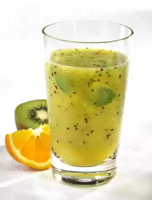 Peel the kiwis and cut the flesh into small pieces. Add vanilla pulp, lemon juice and vanillin sugar and puree. Fill up with orange juice. Finely chop lemon balm leaves and stir in