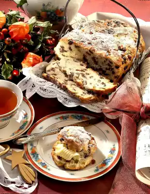 Warm up the milk. Put the flour in a large bowl and press a depression in the middle. Crumble yeast into it. Add sugar and milk and mix to a pre-dough. Cover and leave to rise in a warm place for about 20 minutes. In the meantime melt butter, add vanilla sugar, cardamom and mix. Coarsely chop the almonds. Wash the raisins and dab dry. Knead butter mixture and pre-dough to a smooth dough. Stir almonds, raisins, lemon peel, lemon juice and lemon peel into the yeast dough. Cover and leave to rise again for about 40 minutes. Remove 1/3 of the dough and form 8 small round or oval rolls. Form an oblong loaf from the remaining dough and let both rise for 15 minutes. Bake the loaf in a preheated oven (electric: 175 °C/ gas: level 2) for about 1 1/4 hours. Bake the rolls for 15-20 minutes. Let the roll and bread cool down and dust with icing sugar