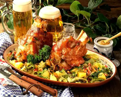 Season with salt, pepper and mustard. Fold in the potatoes. Serve the knuckles and vegetables sprinkled with bacon and onions and freshly chopped parsley.
