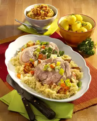 Stir in broth and cook covered for about 1 hour. Puree peas, stir in some more knuckle of pork stock. Season to taste with salt and pepper. Spread 1/4 of the bacon on the puree. Mix the remaining bacon into the sauerkraut. Arrange the knuckle of pork on the sauerkraut and garnish with vegetables. Garnish with parsley. Boiled potatoes taste good with it