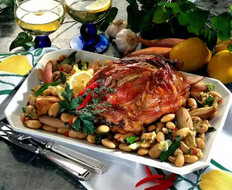 Put into the preheated oven and braise for about 2 1/4 hours (electric cooker: 200 °C/ gas: level 3). Pour approx. 1/8 litre stock over the knuckle of pork bit by bit at intervals of approx. 20 minutes. In the meantime, drain and drain the beans. Peel the shallots and cut them in half lengthwise. Clean and wash spring onions and cut them into bite-sized pieces. Carve chilli lengthwise, cut into fine rings. Wash thyme, pluck leaves from the stalks. Place the shallots, spring onions and chillies around the knuckle 45 minutes before the end of the cooking time. Drizzle with olive oil. Add beans and thyme 10 minutes before the end of the cooking time.