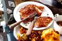Wash parsley and shake dry, pluck the leaves and chop finely. Peel onions, dice 1 onion. Peel, wash and finely grate the potatoes. Knead with minced meat, egg, diced onion, half of the parsley, paprika and tomato paste, 1 teaspoon cumin, 1 level teaspoon salt and 1⁄2 teaspoon chili flakes.