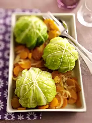 Wash the cabbage leaves and cut the thick panicles flat. Blanch the cabbage leaves in salt water for about 5 minutes. Take them out, rinse them under cold water and let them drain on a tea towel.