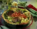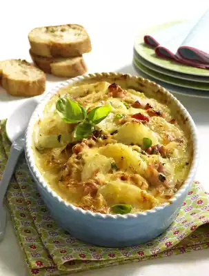 Bind the cream mixture with sauce thickener, bring to the boil. Season to taste with salt and pepper. Stir in basil and ham. Pour into a casserole dish and sprinkle with cheese. Gratinate under a hot grill or in a preheated oven (electric cooker: 225 °C/ convection oven: 200 °C/ gas: level 4) for 5-7 minutes. Garnish with basil