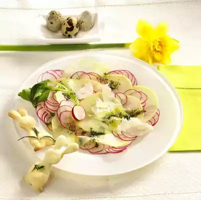 Clean the kohlrabi and radishes, except some for garnishing. Peel kohlrabi and cut into fine slices. Wash the radishes and also cut into fine slices. Arrange radish and kohlrabi slices in a ring on plates and sprinkle with vinaigrette. Slice the parmesan and sprinkle over it. Garnish with radishes. Serve with pizza bunnies