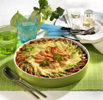 Layer the vegetables in flakes in a gratin dish (approx. 27 cm Ø) and pour the sauce over them. Sprinkle with parmesan and bake in the preheated oven (electric cooker: 200 °C/ convection oven: 175 °C/ gas: level 3) for 30-40 minutes.