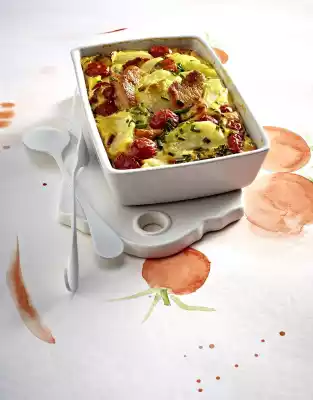 Whisk sour cream with eggs. Season with salt, pepper and nutmeg, pour over the vegetables. Bake in the preheated oven (electric cooker: 175 °C/ convection oven: 150 °C/ gas: see manufacturer) for 30-40 minutes until the egg icing has set. Wash cutlets, dab dry.