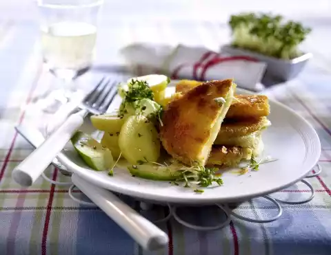 Fry escalopes in portions on both sides until golden brown, keep warm. Cut cress from the bed and fold into the salad. Season to taste, arrange everything.