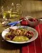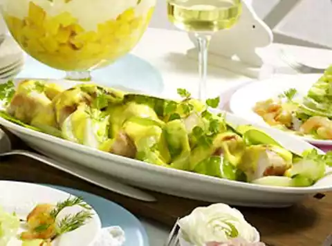 Fill the kohlrabi, snow peas and meat into a large casserole dish. Pour hollandaise sauce over it. Bake in the preheated oven (electric cooker: 200 °C/circulating air: 175 °C/gas: level 3) for 10-15 minutes. Garnish with chervil for serving. Served with baguette