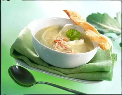 Cover and cook for 15-20 minutes. Wash the coriander greens, dab dry and chop coarsely except for a little to garnish. Add cream, coriander and kohlrabi greens to the soup and puree everything finely with a chopping stick. Season to taste with salt and pepper and heat the kohlrabi curls in the hot soup for about 1 minute. Arrange in deep bowls and sprinkle with radish sprouts. Garnish with coriander leaves and serve with a pastry stick