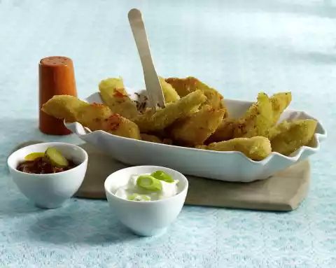 Cut the cucumber into slices. Mix ketchup, paprika and cucumber. Season to taste with pepper sauce. Peel the kohlrabi, cut it into about 1.5 cm thick sticks and season with salt, pepper and nutmeg. Whisk the egg white.