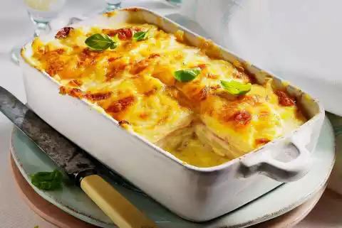 Pour cream over potato gratin and bake in a hot oven for 50-60 minutes.