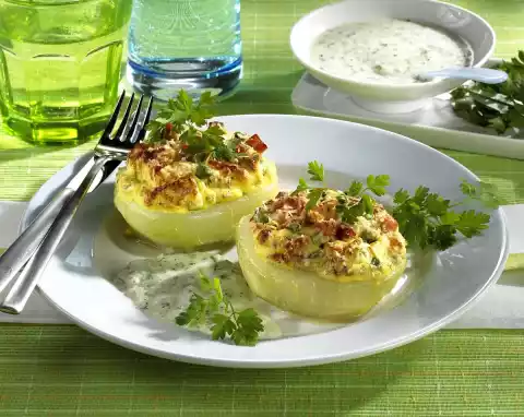 Fill the quark filling into the kohlrabi halves. Put the kohlrabi on the fat pan of the oven. Cook in the preheated oven (electric cooker: 200 °C/ gas: level 3) for 25-30 minutes. Peel and finely dice the onion.