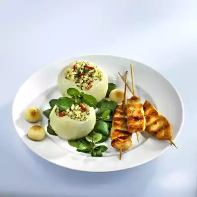 Fry the meat skewers in it in portions for about 6 minutes. Remove and keep warm. Sauté shallots and garlic in cooking fat, deglaze with wine and let it boil down for 5 minutes. Add tender wheat and chopped watercress and fry briefly. Season with salt and 1 pinch of sugar. In the meantime, heat 1 tablespoon of oil in a second pan and fry the kohlrabi balls in it until golden brown. Take them out. Wash and clean the pepper and cut into rings. Stir into the tender wheat. Pour the tender wheat into the kohlrabi bowls. Arrange chicken skewers, kohlrabi balls and bowls on watercress bed on plates