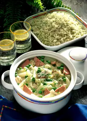Bring rice to the boil in 1/4 litre salted water and cook over a low heat for about 20 minutes. Peel, wash and cut kohlrabi into sticks. Put into 1/2 litre boiling salted water and cook for about 10 minutes. Wash the mushrooms, drain and cut in half. Peel the skin from the sausage, cut the sausage lengthwise in half and cut into slices. Add peas, mushrooms and sausage to the kohlrabi and cook for 3-5 minutes. Stir flour and some cold water until smooth, pour into the boiling stew and bring to the boil again.
