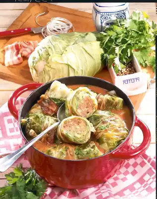 Cook everything over medium heat for 45 minutes. Take out the cabbage rolls. Stir the flour in a little cold water until smooth and thicken the sauce with it. Put the roulades back into the sauce. Wash the parsley, chop finely and sprinkle over the cabbage rolls. Boiled potatoes taste good with it