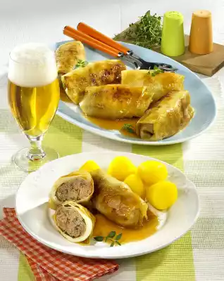 Season with salt, pepper and paprika. Spread the minced meat dough on the cabbage leaves and roll them up. Fix with wooden skewers. Heat clarified butter in a pan. Brown the cabbage rolls in it. Add stock, bring to the boil. Cook the roulades for about 15 minutes. Mix flour and a little water, pour into the stock and bring to the boil while stirring. Arrange cabbage rolls with the sauce on plates.