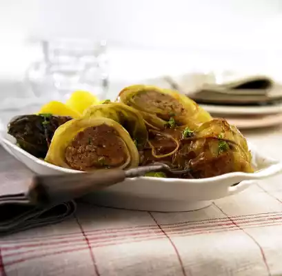 Preparation: Clean the cabbage and cut the struck out wedge-shaped. Cook the cabbage in plenty of boiling water for about 8 minutes. Remove 12 leaves bit by bit. Cut the thick ribs flat. Cut the rest of the cabbage into small pieces.