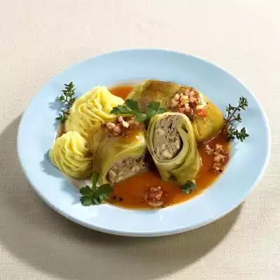 Cut rolls into small cubes and pour hot milk over them. Loosen 12-16 cabbage leaves and blanch in plenty of boiling salted water for about 5 minutes. Cut leaf veins flat. Wash and chop the herbs for the filling. Squeeze out the bread rolls. Knead with herbs, mince and egg.