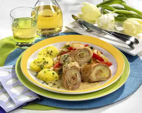 Wash parsley, dab dry and chop. Drain the potatoes, let them evaporate and toss them with the parsley. Cut cabbage rolls in half and arrange on plates with sauce, potatoes and braised cabbage.