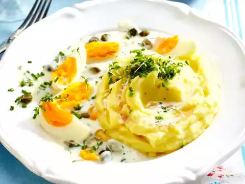 Wash the chives and cut into small rolls. Stir the capers into the sauce, season with salt and pepper. Rinse and peel the eggs. Stir the puree through. Foam 4 tablespoons butter and breadcrumbs. Serve everything. Cut cress from the bed and sprinkle over it.