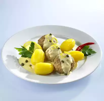 Season with salt, pepper, cayenne pepper and Worcestershire sauce. Form 12 dumplings from the chopped mass. Bring the meat stock to the boil, add the dumplings and let them simmer at low heat for about 10 minutes. Remove and keep warm. Sieve broth, add 250 g cream, bring to the boil and reduce by half. Mix 50 g cream with 2 egg yolks, beat into the hot sauce until it thickens. Do not let it boil any more! Season the sauce with lemon zest, cayenne pepper and Worstershire sauce. Stir in the capers with the liquid. Add meatballs to the sauce and heat up. Arrange Königsberger meatballs on plates.