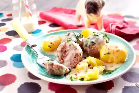 Peel and wash the potatoes and cook them in boiling salted water for 20-25 minutes. Put the meatballs into the lightly boiling salted water and let them simmer in it at medium heat for about 12 minutes.