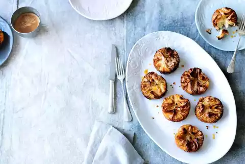 In the meantime cut baking paper into squares of about 10 cm. Line the twelve hollows of a muffin tray with it. Preheat the oven (electric cooker: 200 °C/circulating air: 180 °C/gas: see manufacturer). Roll out the dough on some flour to form a rectangle (approx. 27 x 36 cm). Divide into 12 squares (each approx. 9 x 9 cm). Place 1 square of dough on some sugar, fold the 4 square corners towards the middle and press them down. Place them in the muffin tray and sprinkle with the remaining sugar. Bake in a hot oven for 20-25 minutes.